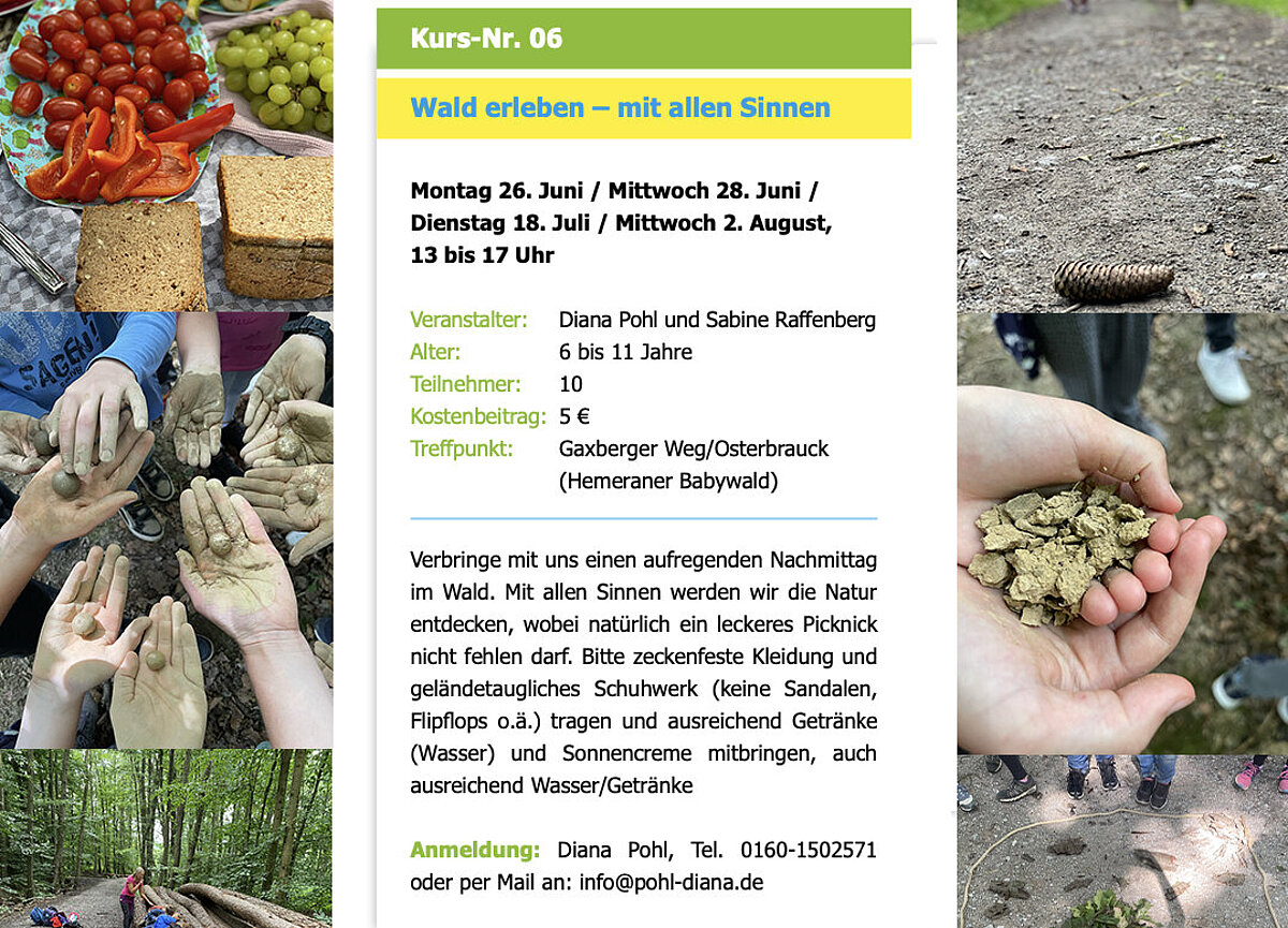 An vier Terminen verbringen wir mit Kindern einen schönen Nachmittag im Wald. Es ist jedes Mal - auch für uns - ein tolles Erlebnis: Natur genießen, entspannen, gemeinsam den Wald entdecken - und natürlich darf auch ein leckeres Picknick nicht fehlen.